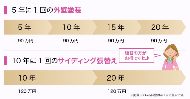 外壁塗装に比べると、サイディング張り替えは1回のリフォーム費用がやや高くなってしまいます。